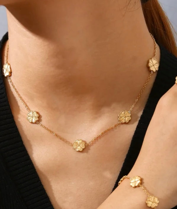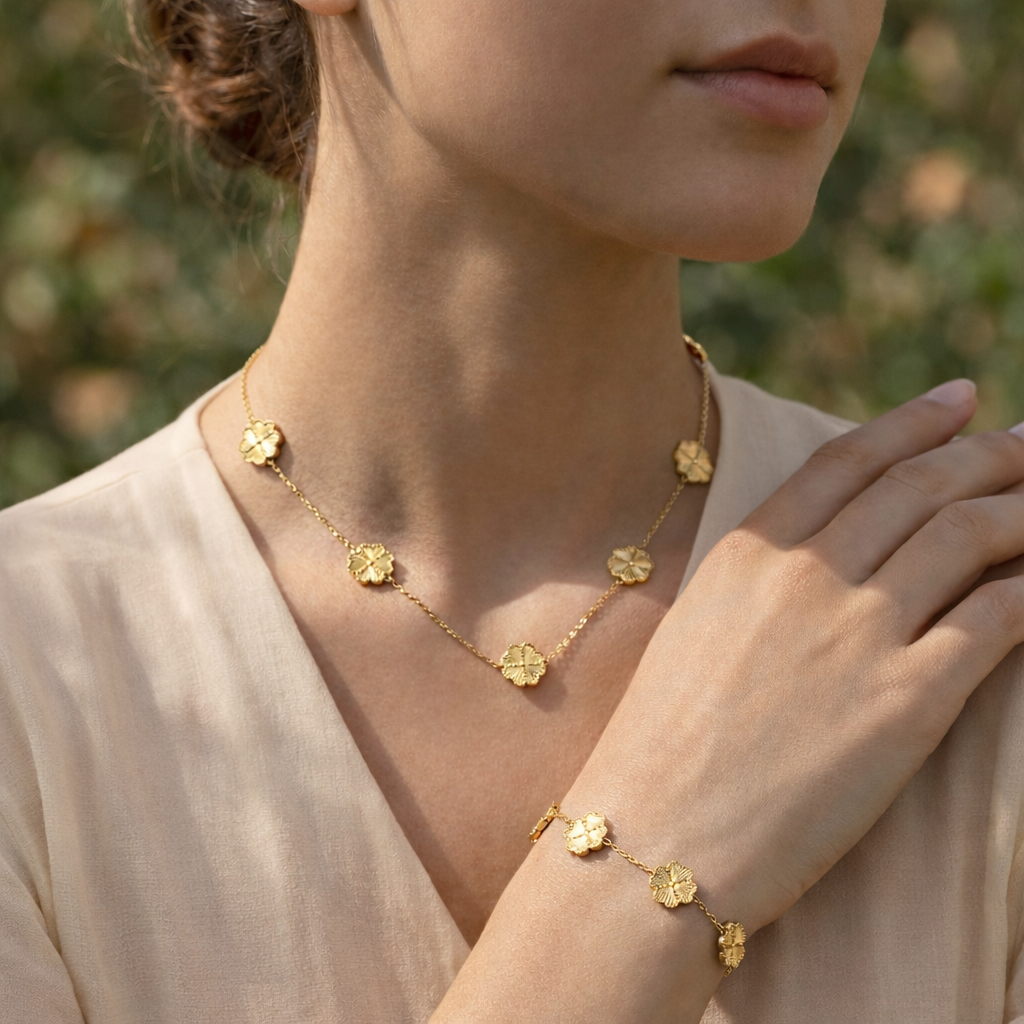 Delicate yet striking, this floral necklace and bracelet set is designed to add a soft glow to your everyday elegance. Featuring finely detailed flower motifs spaced along a sleek gold-toned chain, the set feels light, graceful, and effortlessly chic. Each bloom catches the light beautifully, creating a subtle statement that works just as well for daytime wear as it does for intimate evenings. Wear the pieces together for a coordinated look or style them separately to elevate your minimal wardrobe with a touch of understated luxury.