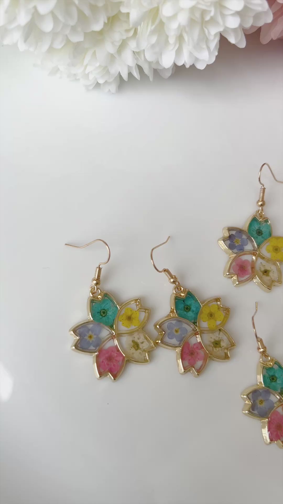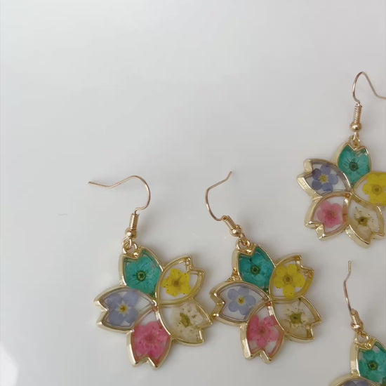 A vibrant cascade of pressed flowers encased in petal-shaped frames — these earrings bring together turquoise, pink, yellow, and lavender tones for a bold yet delicate floral statement.