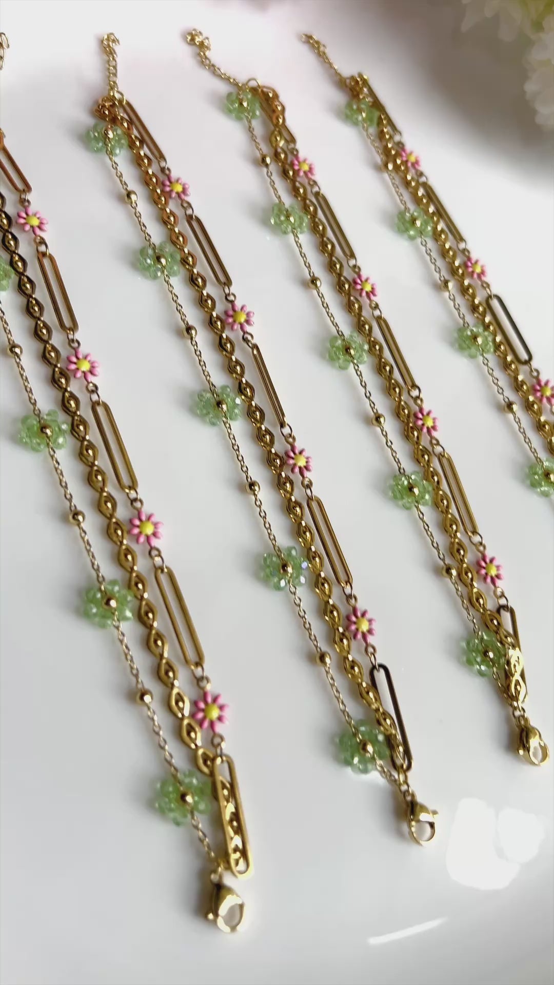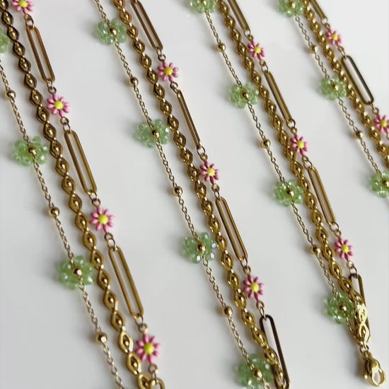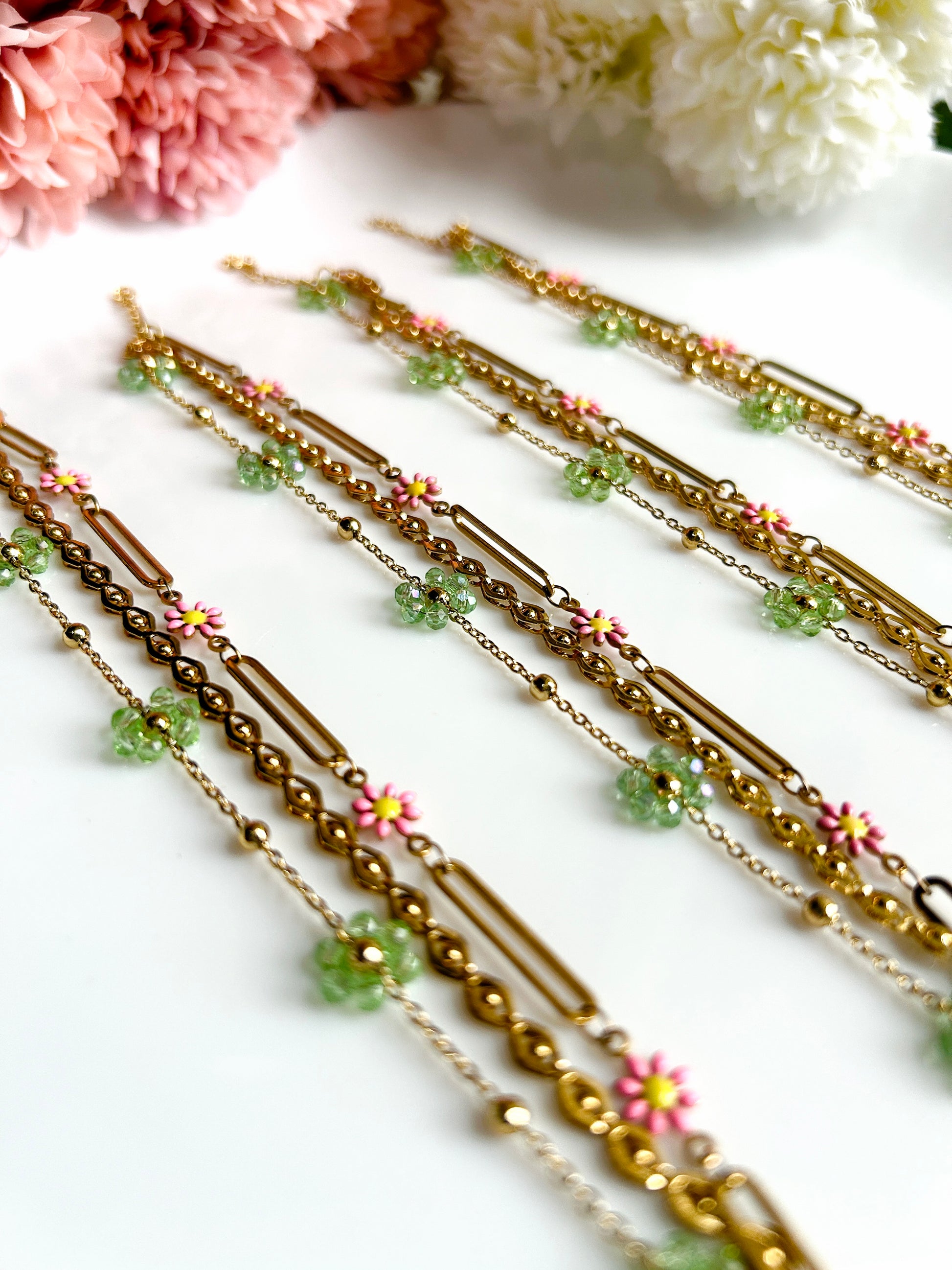 Delicate chains of gold meet whimsical green crystal clusters and dainty pink daisies in this radiant floral bracelet. A perfect blend of elegance and playfulness for everyday charm.