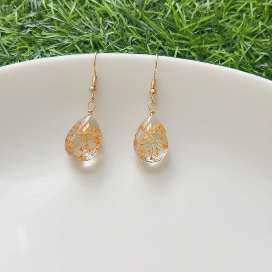 Golden orange florals nestled in clear resin, inspired by meadows at sunset. These earrings radiate warmth, joy, and handcrafted charm – ideal for brightening up any day or outfit.